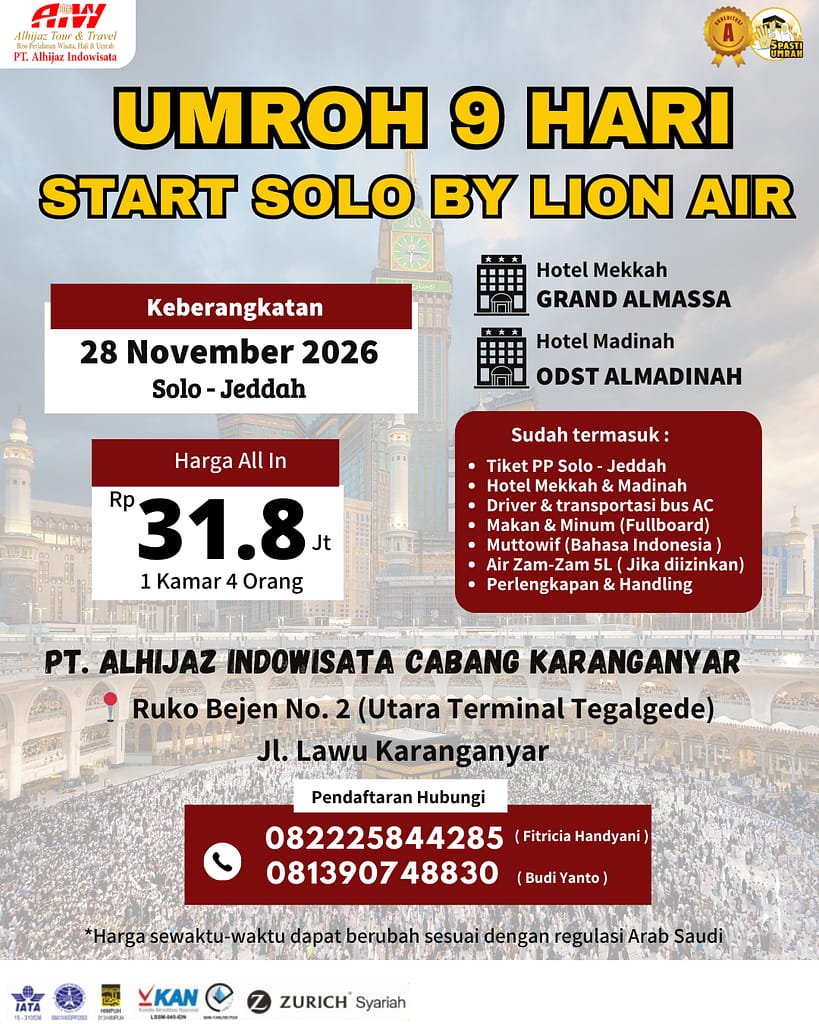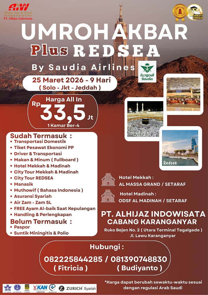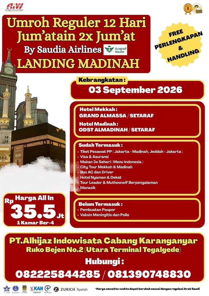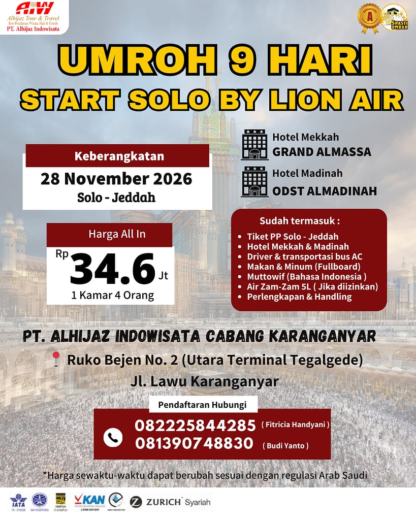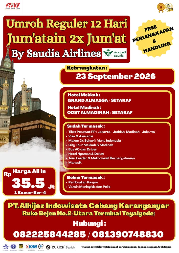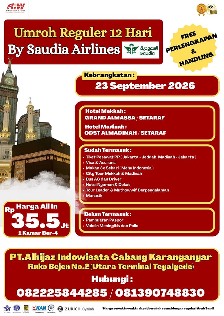 Alhamdulillah pelayanannya informatif dan fast response. Paket dan detail jadwal yang ditawarkan juga sangat jelas. Kantornya rapi dan wangi. Sangat rekomen.