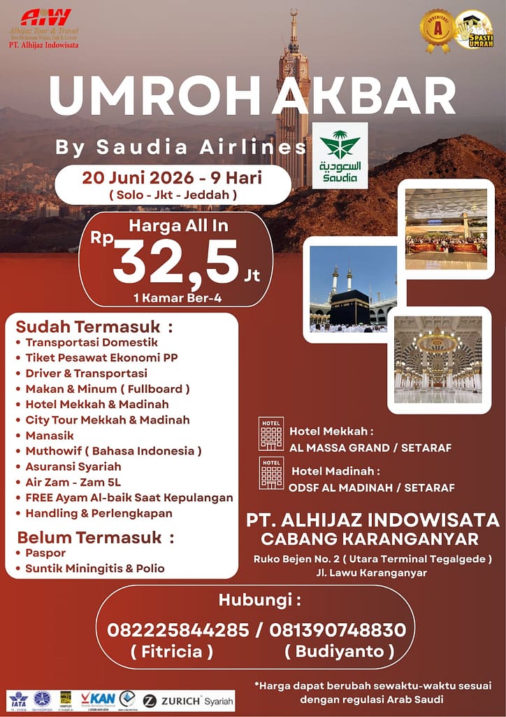 Jazakumullahu khairan buat team Alhijaz Tour yang telah memfasilitasi kami. Alhamdulillah Umroh di Alhijaz Tour diberikan kelancaran, proses pendaftaran dan surat lancar, handling koper baik jamaah kami menginap nunggu atau drop di depan kamar, hotel nyaman dan dek dekat dengan Masjid Nabawi dan Masjidil Haram, makanan alhamdulillah enak dan banyak. “Umroh di Alhijaz Tour Makan Nyaman, Tidur Nyaman Tenang Ibadah